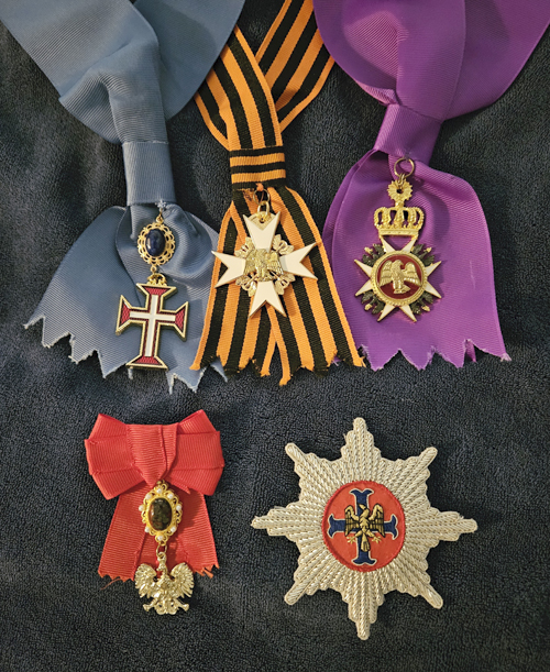 ![]() Principal Chivalric Insignia used by H.A.H. the Apostolic Princess The above does not reflect the totality of insignia received by H.A.H. She holds the senior rank in all of the religious-dynastic orders of the Roman-Ruthenian Church and State. Rather, these represent the primarily-used insignia. Top Row L-R: Dame of the Supreme Roman-Ruthenian Aquline Order of Christ, Grand Commander of the Order of Sts. George and Olga, and Dame Grand Cross of the Religious and Military Order of Sts. Anne and Alexander Nevsky Bottom Row L-R: Bailiff of the Most Holy Pontifical Order of the Eagle, tinsel star of the Order of Sts. Anne and Alexander Nevsky Not shown: Grand collar chains of the Order of Christ and the Most Holy Order |