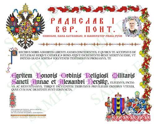 The Religious and Military Order of Sts. Anne and Alexander Nevsky is a religious-dynastic order that may be awarded to recognise those commissioned officers who exhibit either military excellence consistent with the doctrine of the Christian faith or who exhibit excellence in Christian humanitarian service. Also, all Grand Dukes and Grand Duchesses of Rome receive the Grand Cross of the order immediately upon receiving the title. All Grand Dukes/Duchesses of Rome-Ruthenia receive the order immediately following their baptism. As a military dynatic order, it ranks immediately above the Pontifical Order of the Eagle. Recipients of the Grand Cross are automatically also named Knights or Dames Grand Cross of the Companions of the Pontifical Order of the Eagle. The patron saints of the order are St. Anne, mother of the Blessed Virgin, and St. Alexander Nevsky, Grand Prince of Kiev, of the Russian Rurikid dynasty. It takes its name from the name saints of Hanna Alexandrovna, Apostolic Princess of Rome-Ruthenia.
